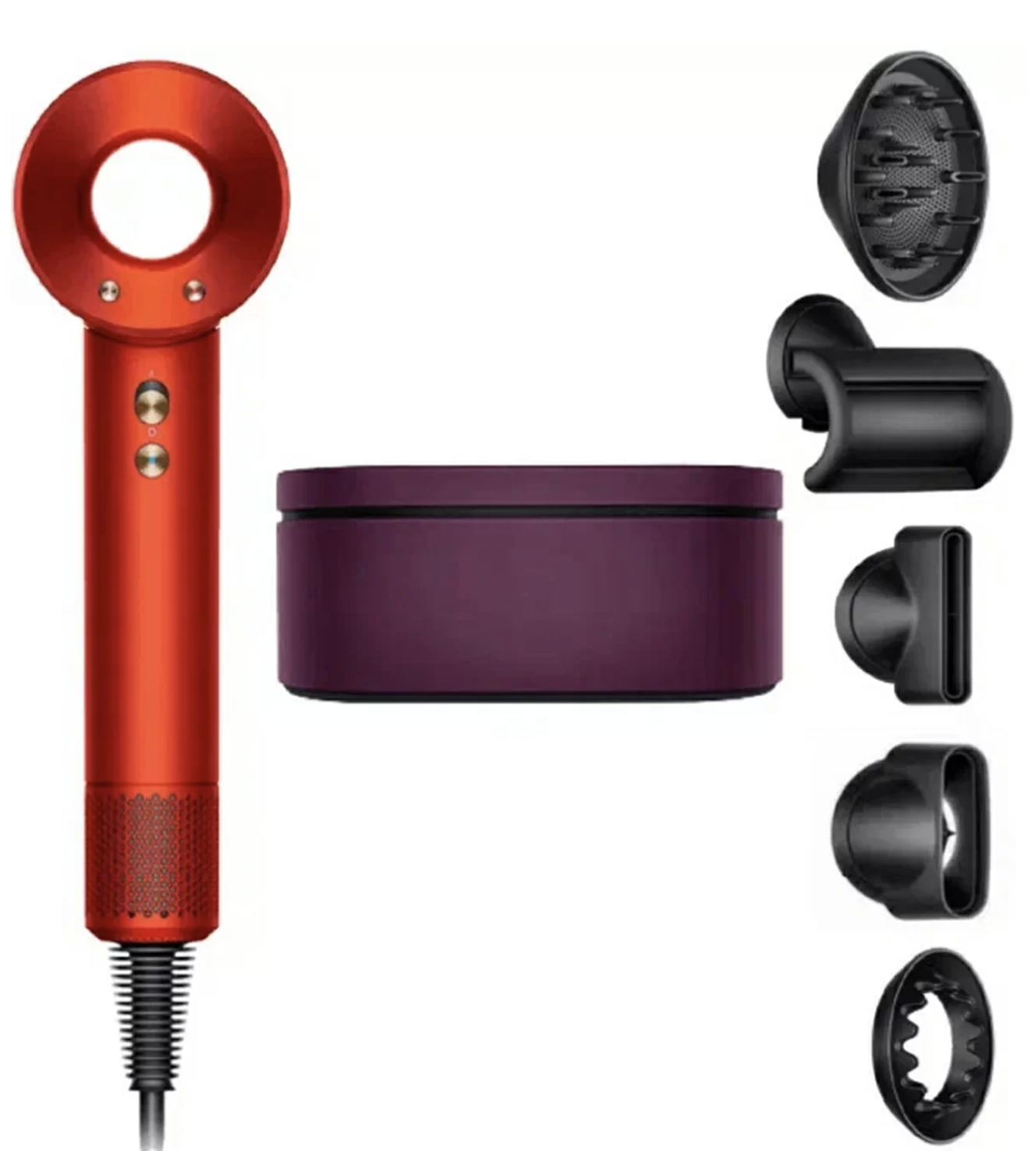 • В комплекте Фен, 5 насадок (насадка для деликатной укладки, насадка-концентратор, диффузор, насадка для бережного высушивания волос, насадка-разглаживающая), кейс, инструкция